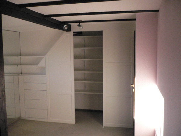 Begehbarer Kleiderschrank in Dachschräge. Schiebetür mit klassischer Rahmen- und Füllungsgestaltung, weiß lackiert. Schubkästen mit griffloser Tip-on Technik.