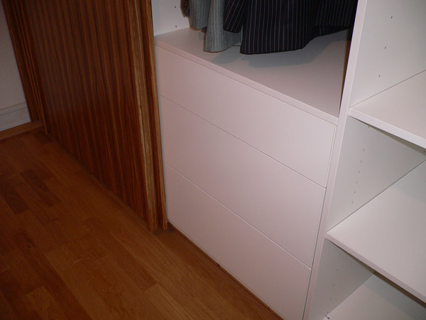 Die Inneneinrichtung des Schrankes erfolgt nun nach Ihren Wünschen. Es gilt eine Auswahl zu treffen unter den angebotenen Beschlägen wie Hosenauszügen, Krawattenauszügen, Haken und Kleiderstangen, Körben, ausziehbaren Böden, Einlegeböden oder gegebenenfalls Liften. Außerdem wird die Anzahl und Position von Schubkästen bestimmt (s. Fotos 5 - 8).