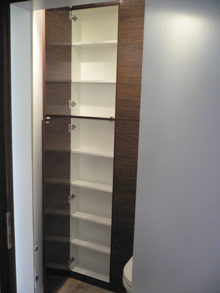 Wandverkleidung in Holzdekor mit hochglanzfinish. Hinter den grifflosen Türen befinden sich Schrankkorpen. WC als Vorsatzmontage an die Verkleidung.